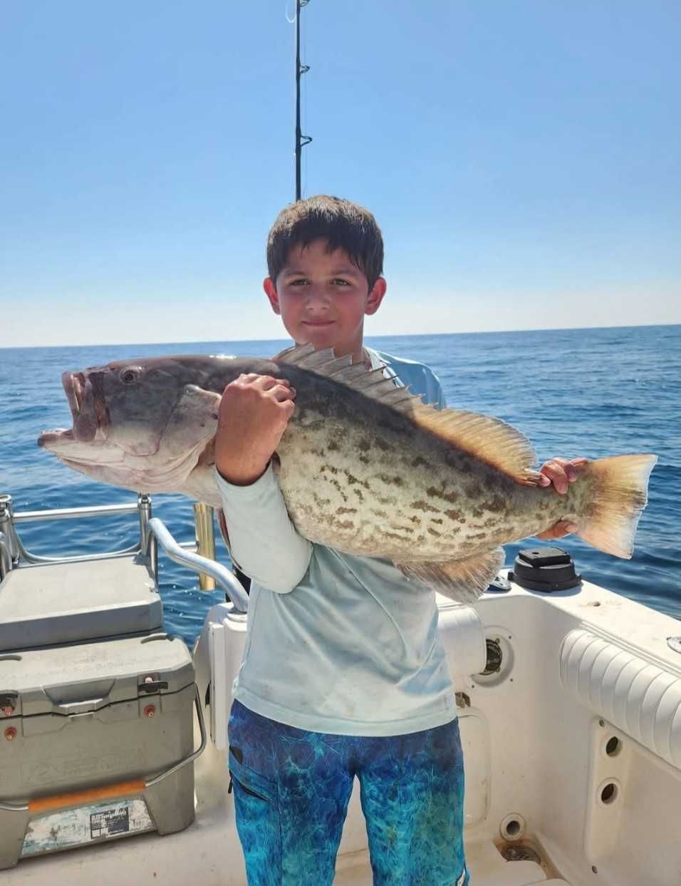 Goliath Grouper live up to their name - these monsters can grow over 8 feet long and top 800 pounds. We find them in relatively shallow water, usually under 150 feet, hanging around reefs, wrecks, and bridges. They're ambush predators that love structure. Goliaths are catch-and-release only these days, but they're still a blast to target. Use heavy tackle - we're talking 80-wide reels and 600-pound test line. Whole fish or big live baits are the way to go. When you hook one, be ready for a short but intense fight. These fish have serious power and will try to bolt straight back to their hideout. Summer's the best time to find them when they gather to spawn. Local trick: bounce your bait off the bottom to get their attention. Goliaths are curious and will often come investigate the commotion.
